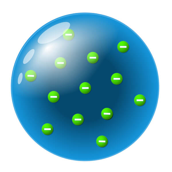 L’électron est découvert par le scientifique Joseph Thomson, et le modèle évolue. Ce modèle est une boule de matière positive remplie de petits grains négatifs, les électrons. On l’appelle aussi le modèle du « pain aux raisins ».